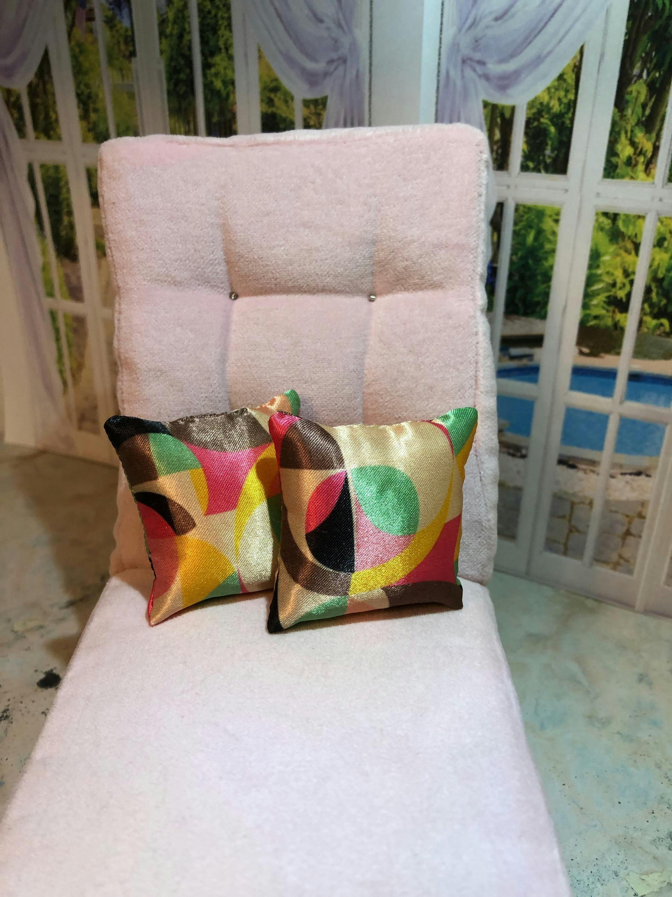 These pillows are just the thing to finish off a couch, bed or patio furniture in your doll's space! The fabric is polyester, they are filled with polyester stuffing and finished with tidy, nearly invisible seams on all four sides of the pillow. Our pillow collections have been curated for colors that all coordinate well together, but there may be pillows in other collections that work well too. Check out the other listings in our pillows section and message us if you'd like design input.